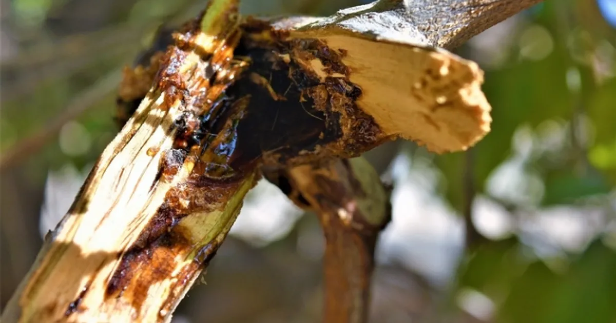 Infection by Nattrassia mangiferae (Hendersonula toruloidea) causes bark cracking and peeling or dead bark that remains tightly attached to dead limbs. Black, sooty growth may develop beneath infected bark. Brownish moist areas appear on limbs during the first stages of disease, then the bark in these areas cracks or peels away revealing black masses of fungal spores (Fig 4.). In advance stages, the injured limbs may “bleed” profusely, oozing a sap like sticky