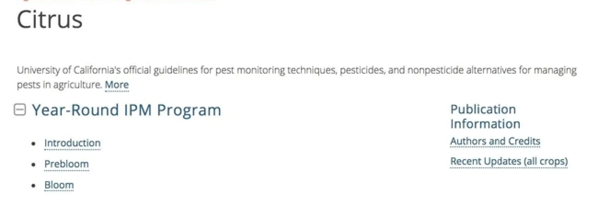 UC IPM revised the weeds, nematodes, plant growth regulators, and diseases sections of the Citrus Pest Management Guidelines! Learn how to manage diseases like anthracnose, bacterial blast, bot gummosis, brown rot, dry root rot, phytophthora gummosis and many more! Check out the new huanglongbing and hyphoderma gummosis sections. Learn also how to increase fruit set & size and reduce fruit drop using the updated section on plant growth regulators. Citrus Pest Management Guidelines (PMG)