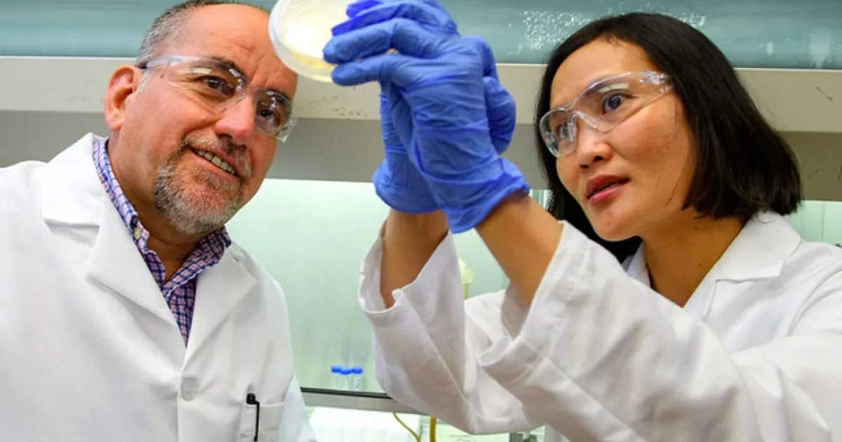 Photo: Phuc Ha and Haluk Beyenal examine a bacterial culture in the laboratory.