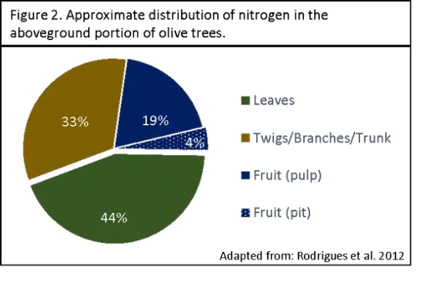 Distribution of nitrogen in the olive tree. Over 75% of the aboveground nitrogen in the olive tree is incorporated in the vegetative biomass (Figure 2). The twigs, secondary branches, main branches, and trunk account for approximately 33% of aboveground nitrogen (Figure 2). Twenty-three percent of the aboveground nitrogen is harbored in the fruit, with the majority in the pulp (19%) (Figure 2). Fruit is only an important nitrogen sink during the initial phase of growth. As fruit size increases, the N concentration decreases due to dilution.