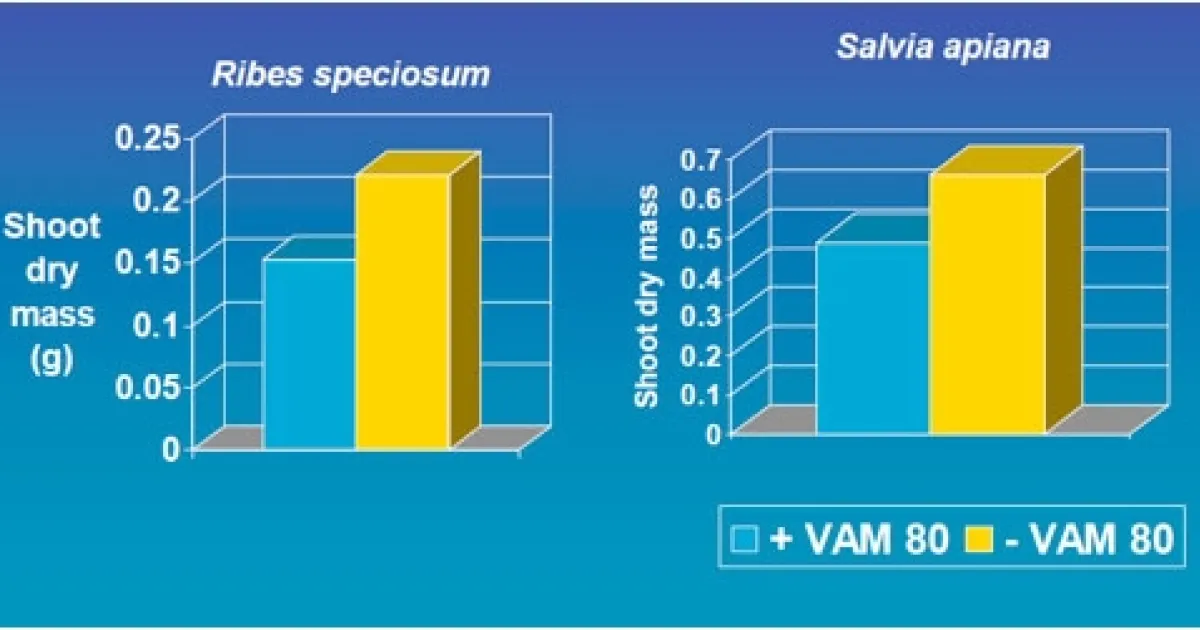In some cases, here with California native plants, inoculation with mycorrhizae had less new shoot growth—measured on a dry basis—than native soil.