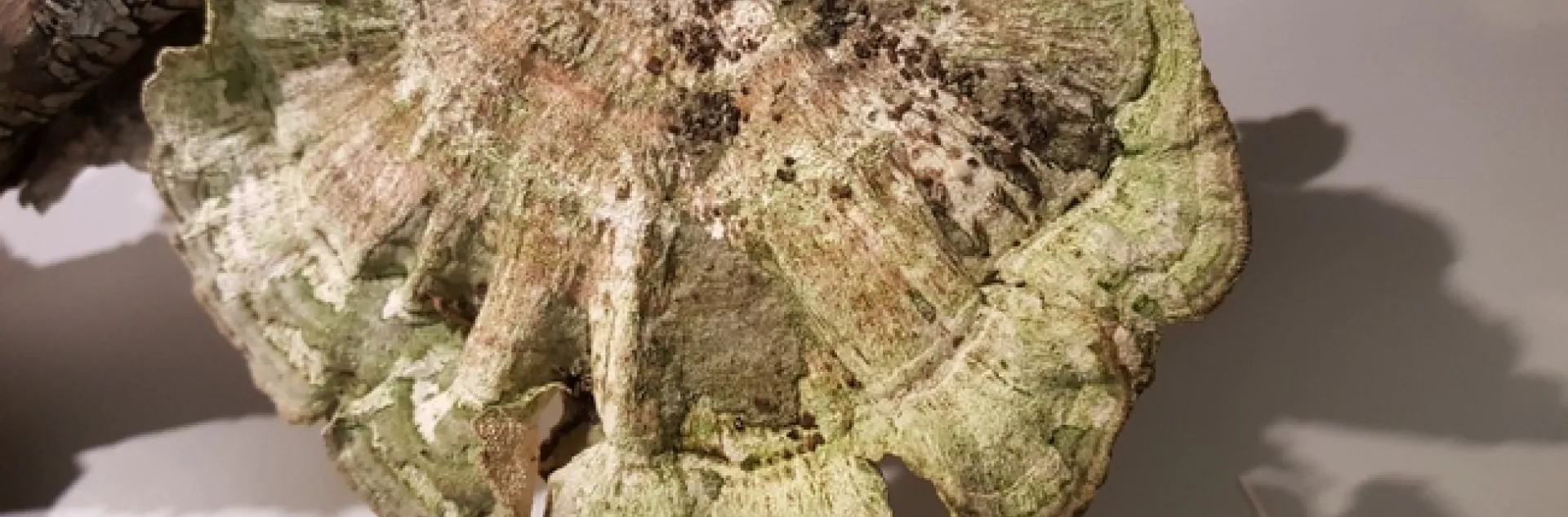 Fig 1. The top of the mushroom cap with green algae coloring it