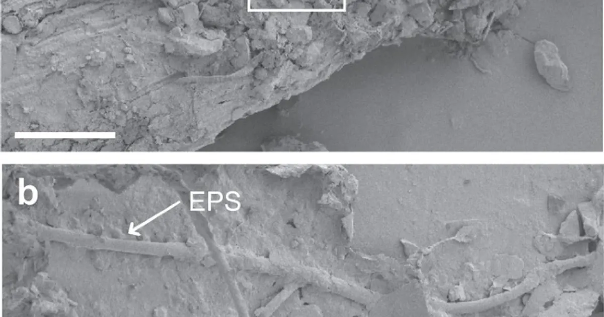 Scanning electron microscopy (SEM) images of the interface of plant litter (POM) and soil minerals, where soil minerals are (a) attached to the litter surface (scale bar = 100 µm) and (b) enmeshed with fungal hyphae and extracellular polymeric substances (EPS; scale bar = 10 µm). Similar images were obtained from at least 10 independent locations in each soil texture.