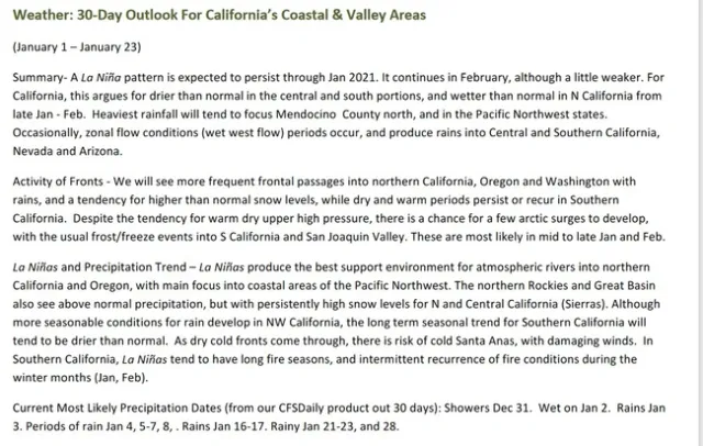A moderate La Niña climate phase is expected through spring 2021. This indicates that slightly above average temperatures and slightly less rainfall than normal can be expected in California's avocado/lemon growing areas.