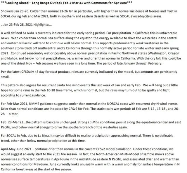 California's most severe freezes have occurred in weak La Niña, weak El Niño or neutral ENSO phases. Severe freezes in Decembers of 1990, 1998, 2001 and 2006 occurred after droughty years and years of low rainfall. In 2015, it snowed in Temecula and again in 2020 – in February!!! So cold weather is still waiting out there.