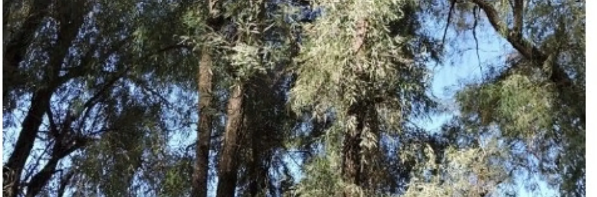The eucalyptus genus includes around 700 species, most of which are native to Australia. Their resilience and drought tolerance have resulted in extensive plantings around the globe, primarily for timber, but also as shade and windbreak trees . Since 1860, when eucalyptus seedlings first became available for planting in California, they have become the most common non-native tree in the state. Eucalyptus stands are associated with negative attributes including poor habitat for wildlife, allelopathic suppression of plants, high combustibility, and for some species the likelihood of dropping branches unexpectedly or blowing over in high wind events. A positive exception is sites, primarily of blue gum (E. globulus), along the Pacific Coast, which are important overwintering sites for the monarch butterfly (Danaus plexippus); although the butterflies prefer native trees. Several species of eucalyptus are recognized as naturalized in California with the ability to regenerate from seed. Currently, two species of eucalyptus, river red gum (Figure 2) and blue gum, are listed as invasive with limited potential by the California Invasive Plant Council (2020), while a third, sugar gum (E. cladocalyx) is listed in the “watch category.