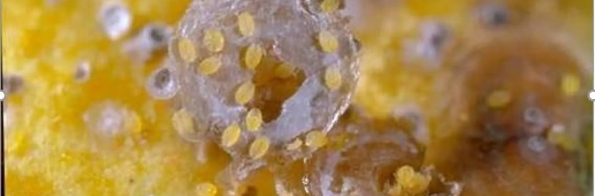 California red scale has an interesting life cycle. CRS start out as mobile crawlers from overwintering females from a previous season (Figure 1), which only remain mobile until they find a suitable location to begin feeding. Once they start feeding, they do not move and go through development being attached to the feeding spot. Males are the only other moving stage (Figure 2). They go through active feeding stage (instars) and a dormant period (molting). Females molt twice and males molt four times and emerge as fliers. Males then find and mate with third instar female. Afterwards, gravid female starts producing crawlers, hence completing the life cycle. In the San Joaquin Valley, there are four complete generations of CRS. In years with warm winters/hot summers, fifth generation crawlers/immatures have been found.