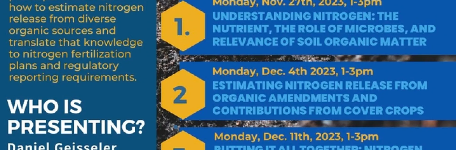 In this 3-part series, participants will learn how to estimate nitrogen release from diverse organic sources and translate that knowledge to nitrogen fertilization plans and regulatory reporting requirements. Over the 3 sessions, we will cover the most common sources of nitrogen and complete a nitrogen budget. In session 2 and 4, participants will be able to work on and receive feedback on their own nitrogen budgets.
