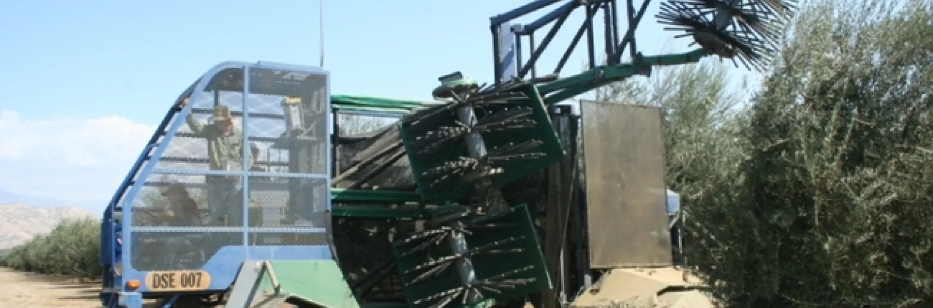 The two viable picking technologies currently being evaluated are canopy contact harvesting heads, and trunk shakers.  The canopy contact harvester can be successfully used in existing orchards that have been pruned to a hedgerow.  It can also be used for newer high density orchards trained to a hedgerow.  The trunk shaking technology can be used in new high density orchards with straight trunks but is ineffective in older conventionally trained orchards.  Interestingly, both have approximately the same final harvest efficiency, from 58% to 63%.  However, the mechanism of fruit removal is different, the two machines harvest different parts of the canopy more efficiently, and the potential for tree damage is different.  However, the final fruit quality as determined by grade at the receiving station of the olive processor is remarkably similar.