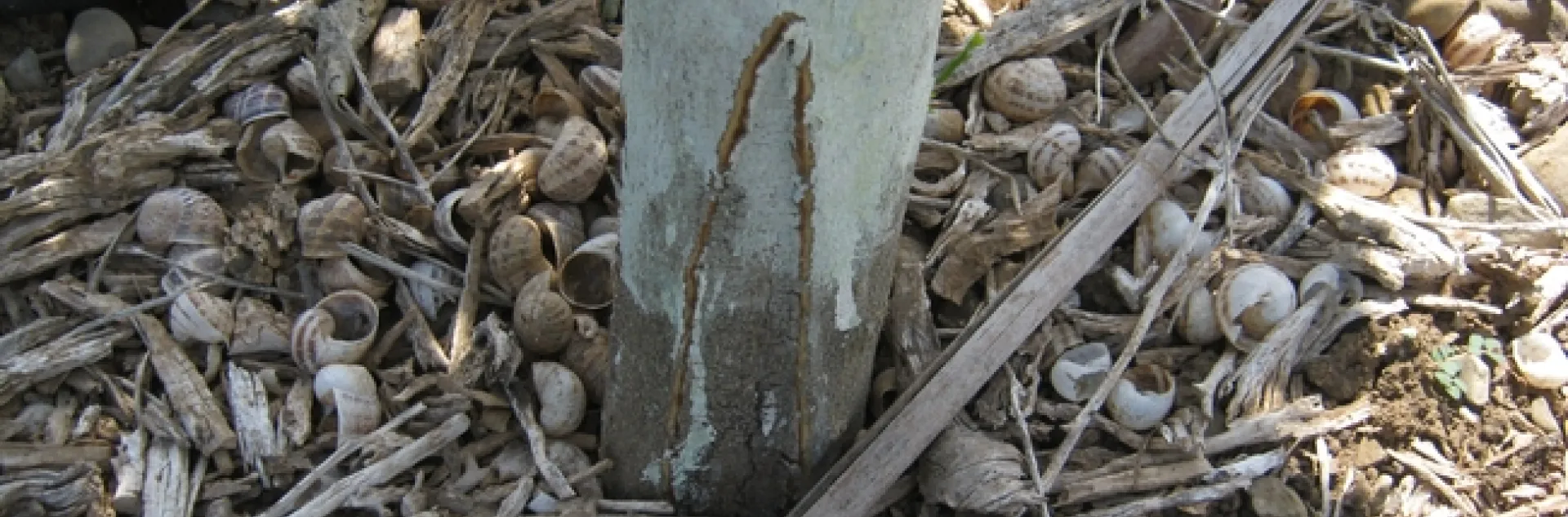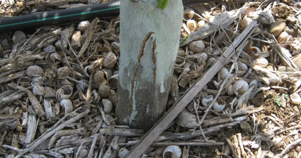 Sunken area of trunk, showing sun burn damage and callus growth starting to grow along margins of damage. Grafted citrus with nurse limbs and whitewash.