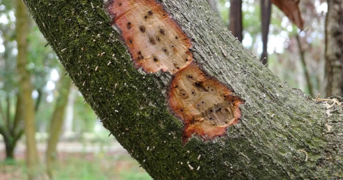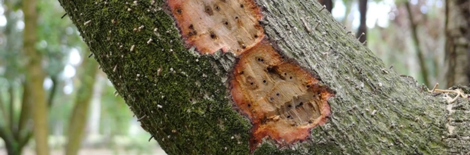 v. Inspection of the trunk and major limbs may show dried sap (white, crystalline powdery material) that indicates insect boring. In any case, on symptomatic limbs remove the bark down to the sapwood and look for dark streaking. Dark streaks in the sapwood may indicate fungal infection. Normally this sapwood should be white to yellowish with no dark staining or streaking. In addition, small, dark holes in the sapwood further indicate wood boring beetles are present.