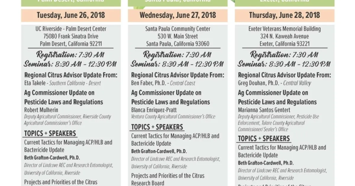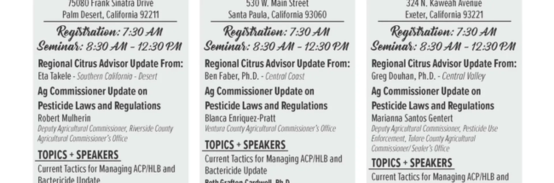 The Citrus Research Board (CRB) is proud to announce the return of the Citrus Grower Seminar Series, co-produced by the University of California Cooperative Extension (UCCE). Three different meeting dates and locations will give growers from different regions the opportunity to attend.