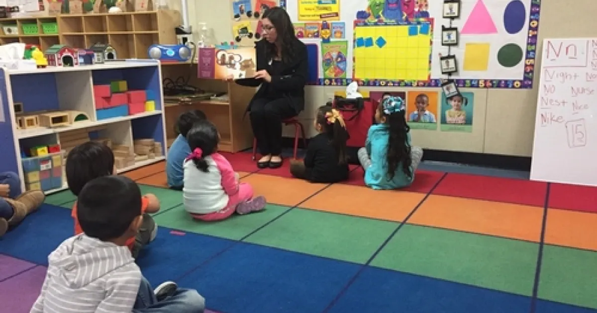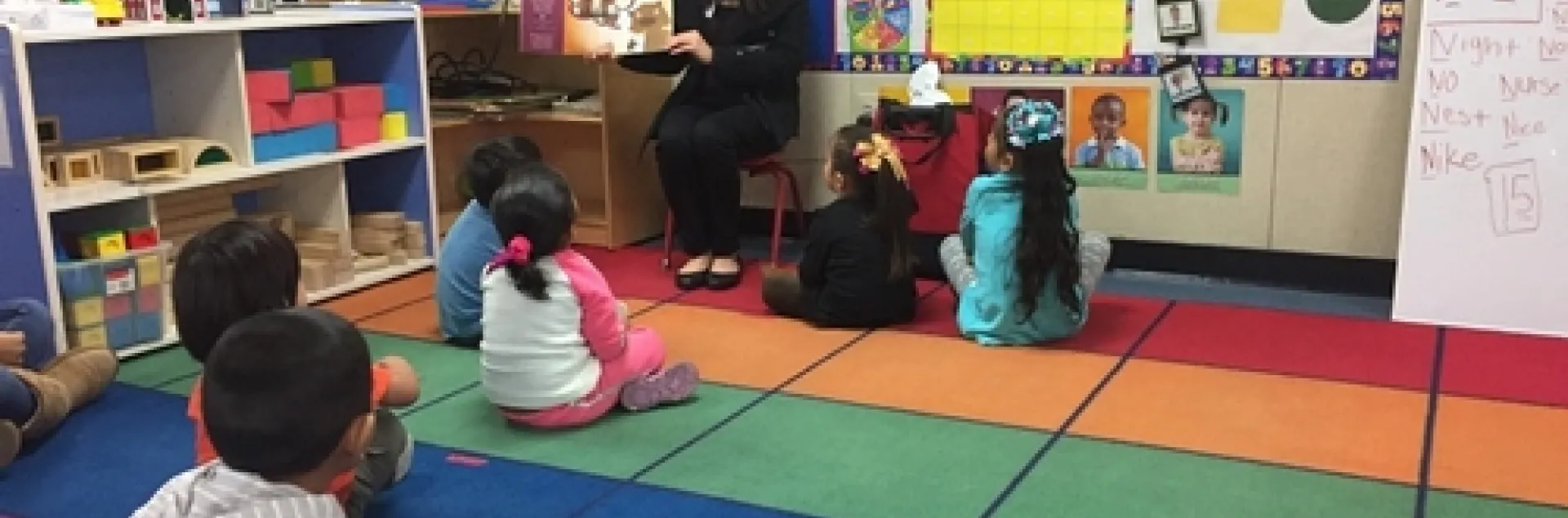 Cassie reads Potter the Otter to the an elementary class