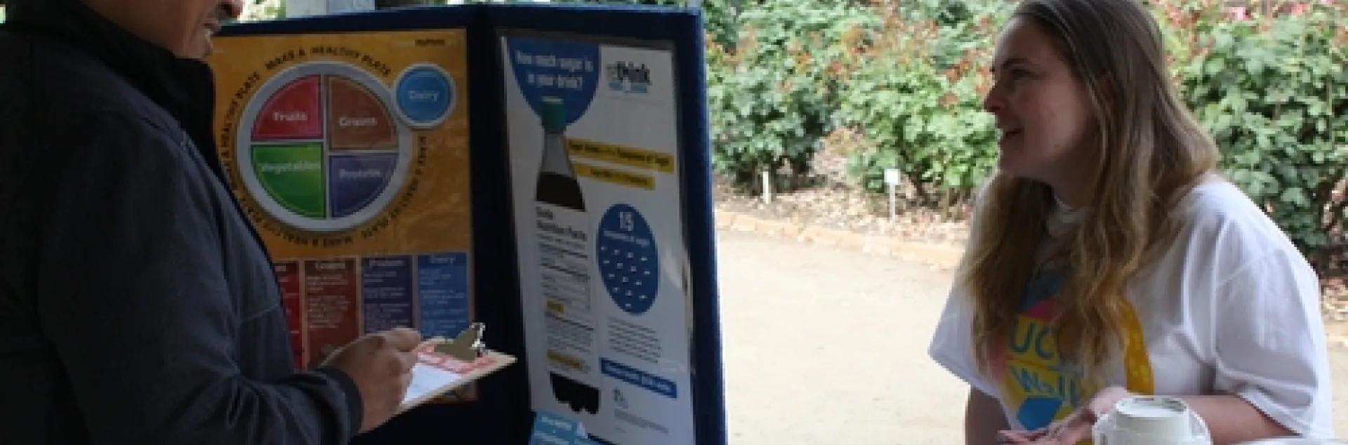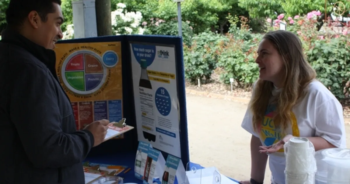 On May 16th, UC CalFresh took part in the Champions for Change: Rethink Your Drink Day campaign. Nutrition educators Ashley Abrahamson and Nora Lopez set up an informational activity booth at UC Walks Day at the Garden of the Sun in Fresno. Their display included nutrition facts of common sugary beverages and bowls to measure the amount of sugar so that participants can truly see what the sugar content in their favorite drinks looks like. Participants were also encouraged to use the Beverage Breakdown website to see how much sugar they end up drinking throughout the entire day. To finish the event, participants were provided a sample of refreshing cucumber and mint water.