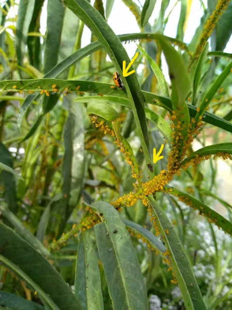 Aphids are like sitting ducks: they usually remain in place while feeding. They will only move if their food runs out or something is irritating them. That makes them a convenient prey for the lady beetle, a very effective natural enemy. In the picture, you can see an adult lady beetle as well as a lady beetle larva, which looks like a tiny black alligator, feeding on aphids. They can eat hundreds of aphids per day and thousands in a life time! Lady beetles are good friends indeed.