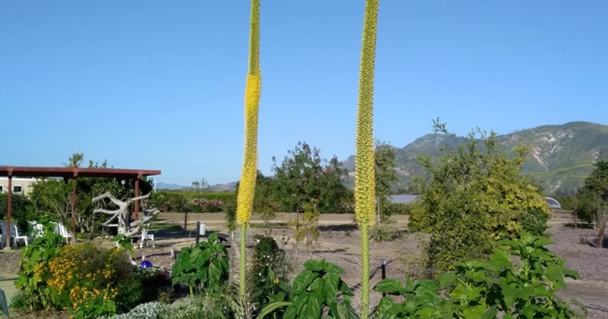 The flowering spikes of the octopus agave (Agave vilmoriniana), currently in bloom in the Master Gardener Demonstration Garden at HAREC in Santa Paula, are seriously impressive at more than 12 feet tall. Octopus agave is a drought-tolerant plant native to the Mexican desert where it grows on rocky ground. The gray-green smooth, twisting leaves with flexible spikes at the tips give the plant an octopus-like appearance. Like other agaves, it is monocarpic, flowering only once in its life before it dies.