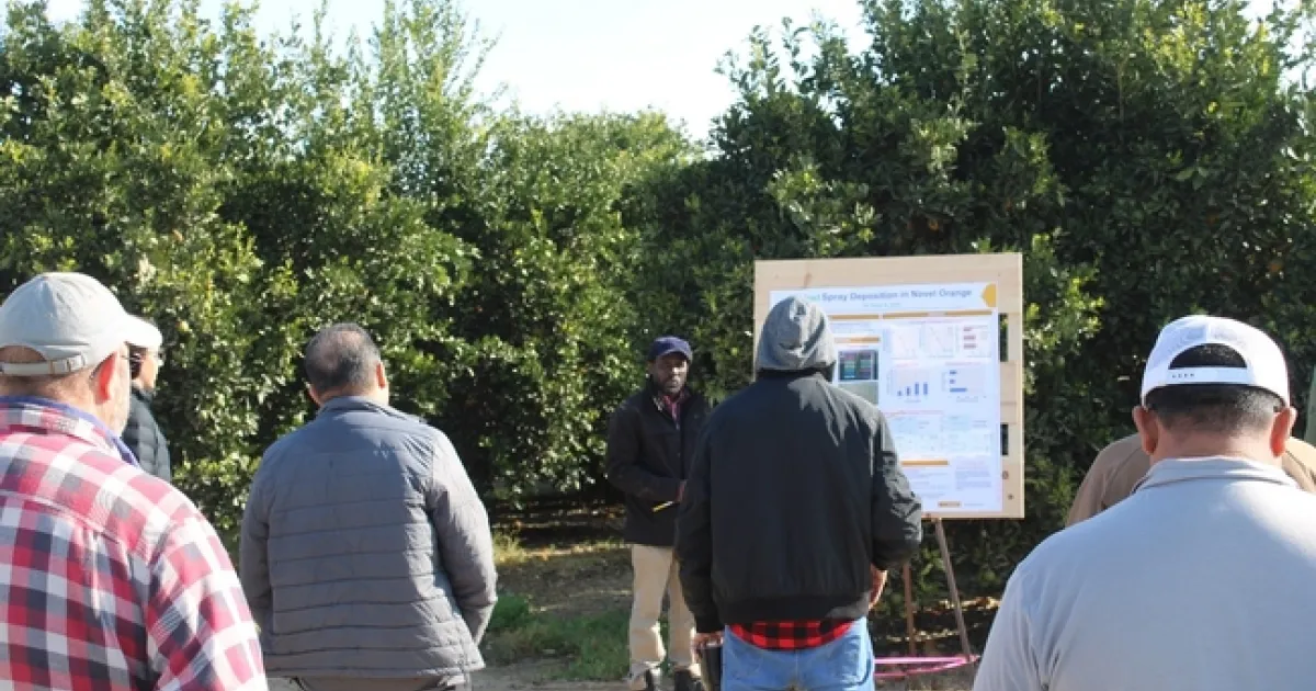 The Citrus Spray Field Day was a 4-hour classroom and field meeting that discussed pesticide application effectiveness, focusing on axial airblast spray applications directed to citrus (and other tree and vine) canopies. It was instructed by Dr. Peter Ako Larbi with support from hisAgricultural Application Engineering (AgAppE) Lab andKARE Center personnel. Discussions covered techniques and considerations for optimizing spray deposition and coverage as well as for minimizing pesticide drift. Sixteen participants were in attendance consisting of growers, applicators/operators, pest control advisers/certified crop advisors, regulators/policymakers, scientists/researchers, and others.