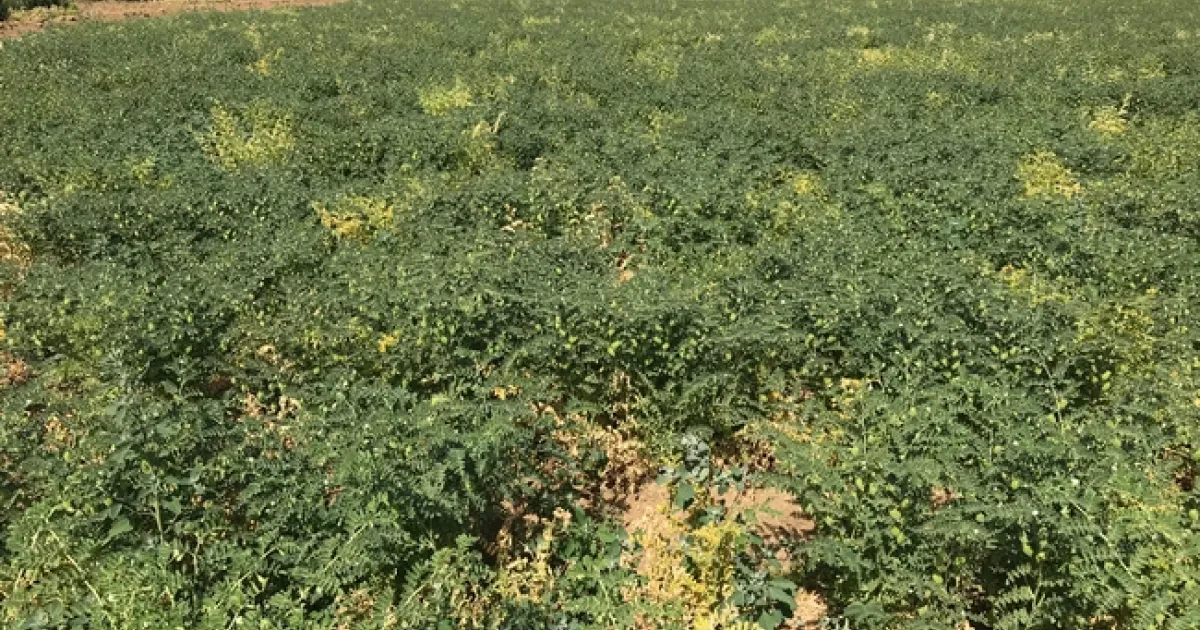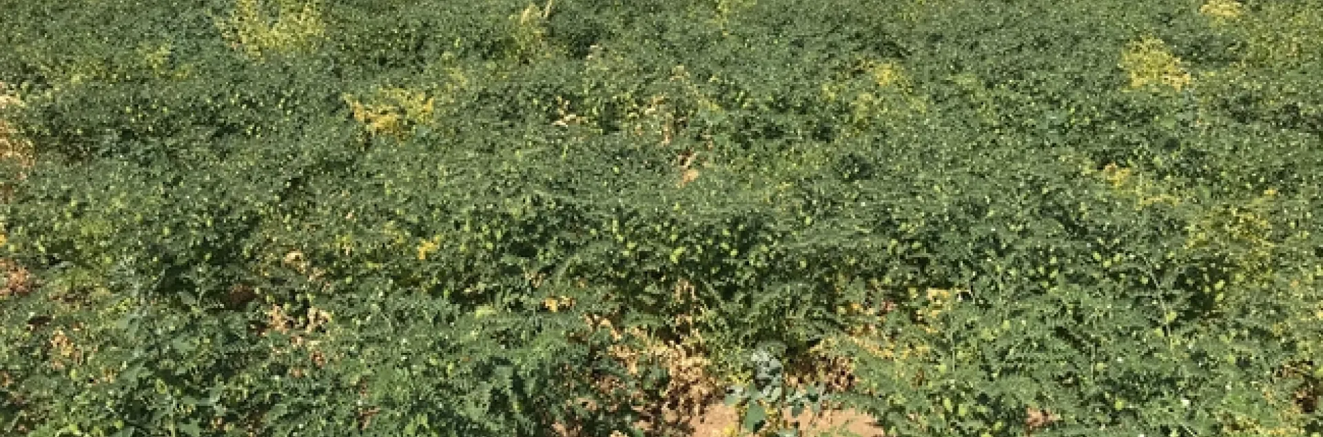 Several garbanzo fields in the Sacramento Valley were infected with alfalfa mosaic virus, a disease that's vectored by aphids. Plant symptoms of viral infections include yellowing wilting, stunting, and dieback. The degree of plant loss and yield decline will depend on the timing of the infection (later infections may not be as damaging). A common theme for viral infections in garbanzos is that there is no pattern to the disease incidence in the field. That is, individual plants scattered throughout the field will show dieback. This is because the infection depends on where the aphids land and feed. Aphids do not colonize (reproduce) on garbanzo plants due to the acids secreted by the plants. Instead, they usually die, so there is minimal lateral spread of the disease from the point of infection.