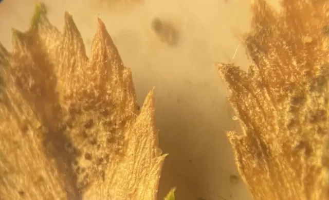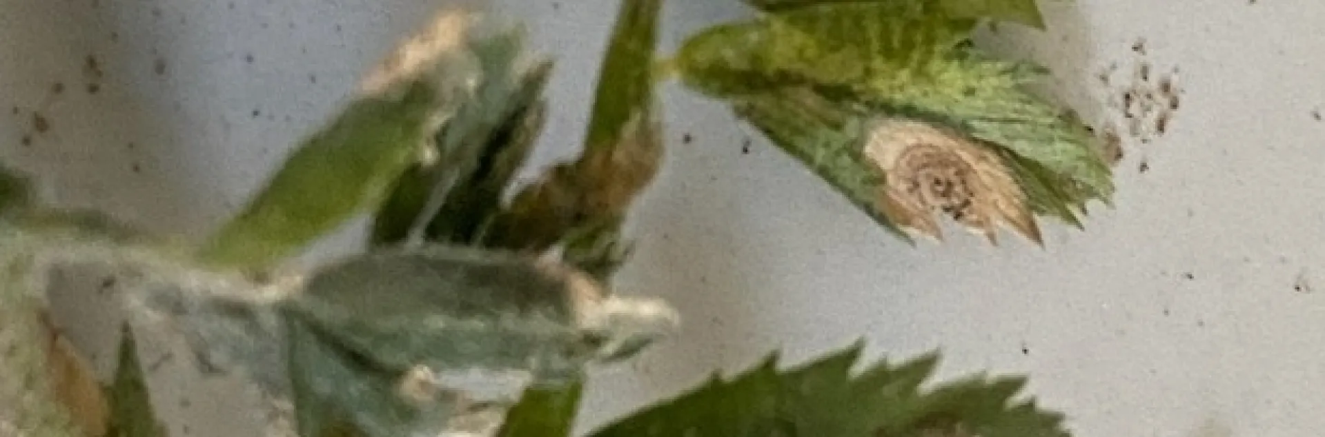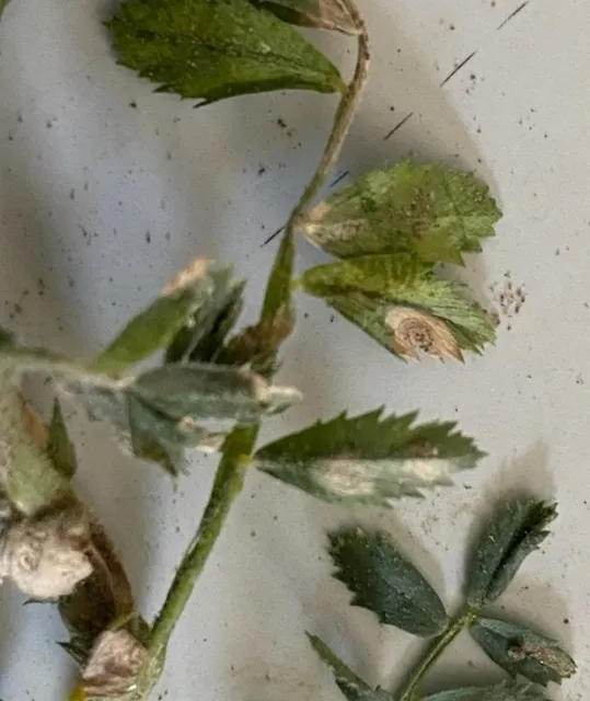 Garbanzo bean leaves with necrosis and small dark ifungal structures (pycnidia) of Ascochyta rabiei.
