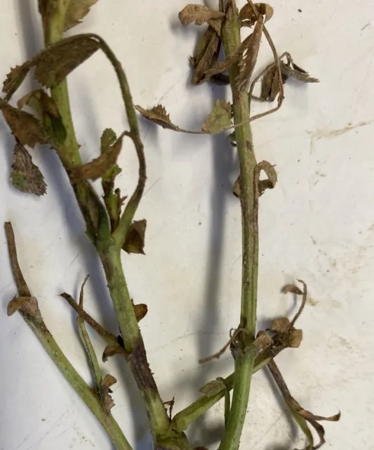 Below are photos by Tom Turini showing typical signs and symptoms of Ascochyta blight of garbanzo on plant samples recently collected in the Five Points/Lemoore area.