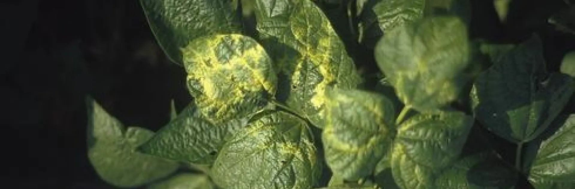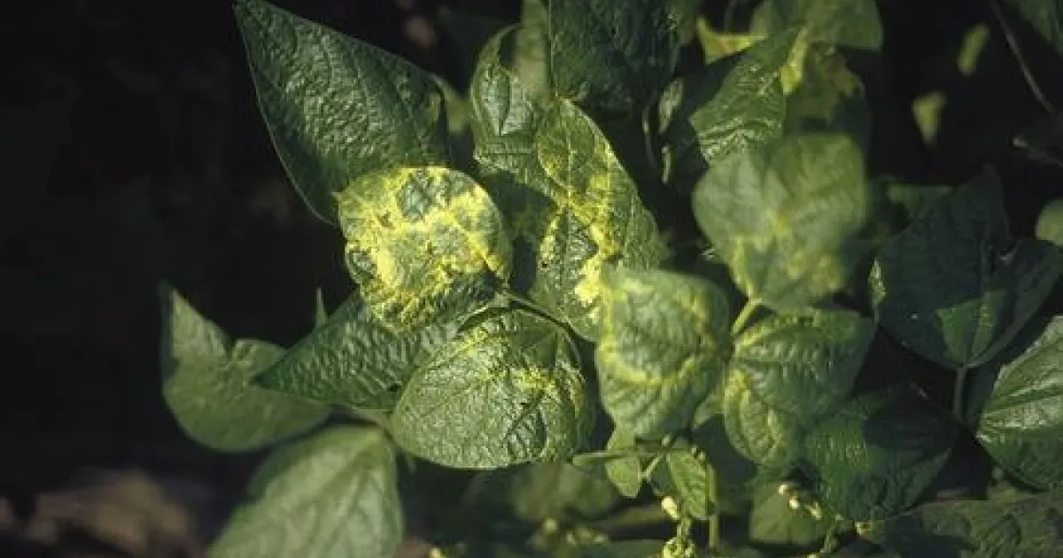 A dry bean plant with yellow-mottled leaves from alfalfa mosaic virus, vectored by aphids. Avoid planting beans adjacent to alfalfa fields.