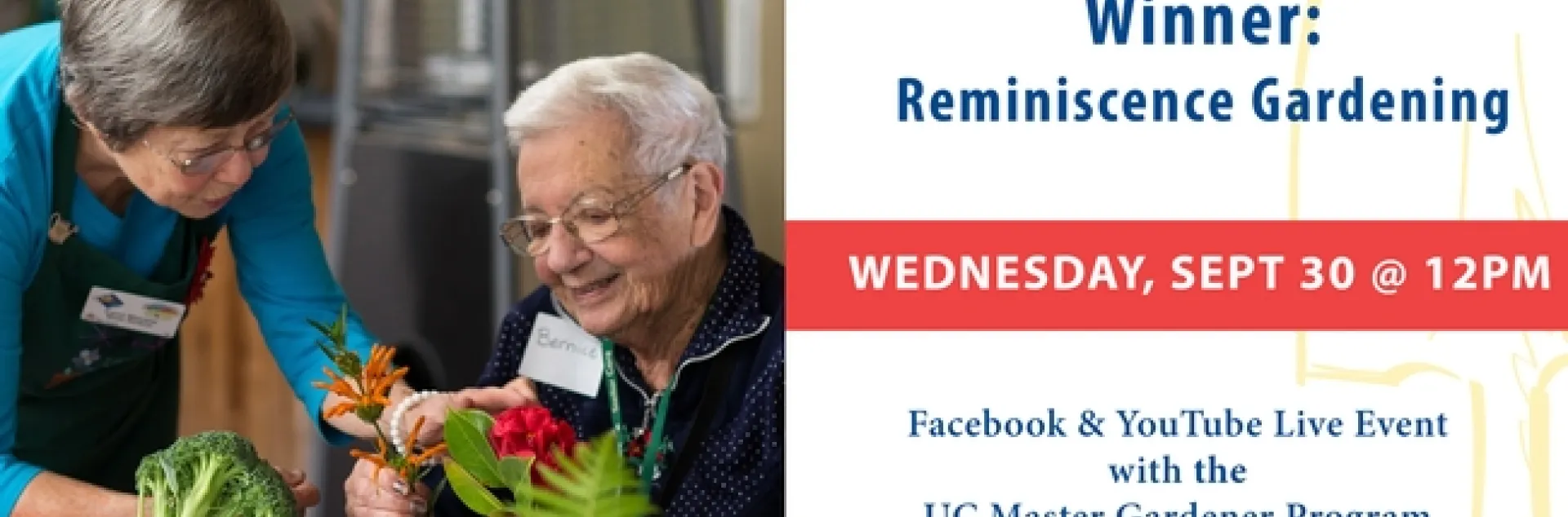 UC Master Gardener volunteers in San Diego County saw an opportunity to collaborate with residential memory care communities and Alzheimer's San Diego to provide sensory exploration and tabletop gardening activities for individuals living with dementia and their care partners. Run by a dedicated committee with co-chairs taking on the planning, scheduling and budgeting responsibility a team of volunteers is brought together for a one hour educational and hands-on activity. Since the projects inception in 2018, and with the help of 50 UC Master Gardener volunteers, more than 1,000 individuals living with dementia and their family members, caregivers and staff have been able to participate. Serving nine different residential care facilities across San Diego County the Reminiscence Gardening project provides step-by-step instructions for gardening activities that can easily be replicated at home.