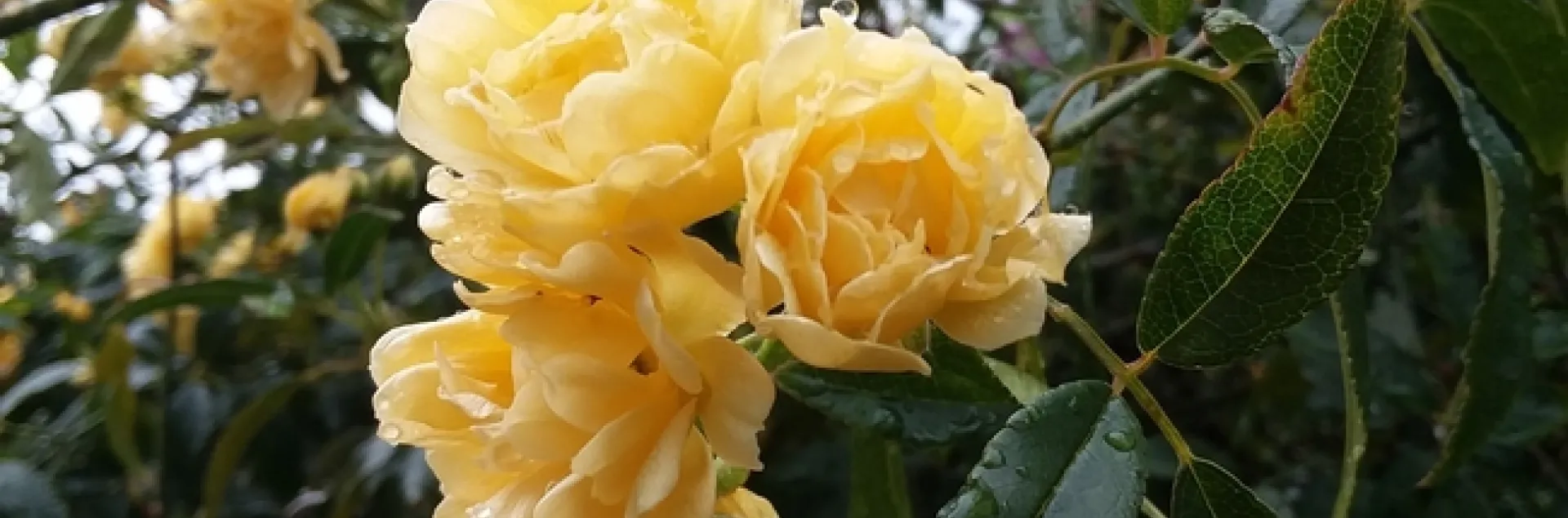 Picture your arbor, fence or bank covered with green foliage and large clusters of yellow or white blossoms in the spring! Originally from China, this climbing rose was named after Dorothea Lady Banks, wife of botanist Sir Joseph Banks. Two varieties include “Lutea” (pictured), with small, scentless double yellow blossoms; and “Alba Plena” with white, violet-scented blossoms. Both have glossy, leathery leaves on stems with a limited number of thorns. Many Rosa Banksiae plants bloom twice, first on last year's post-bloom growth, then on the growth of the current season, which lasts from early to late spring. Blooms attract bees and butterflies.
