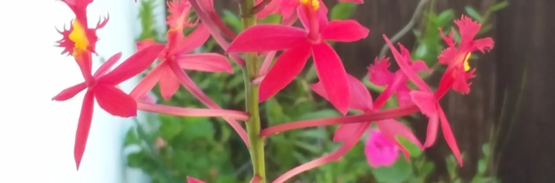 Description: Epidendrums are good starter orchid for first-time orchid growers. They can be kept outdoors where frost is not a factor and can adapt to a variety of light situations. Butterflies are attracted to the red, yellow, fuchsia, orange, or lavender flowers, while deer are not. Flowers grow on top of long stems originating from the base of the plant and each blossom of 20-30 tiny individual frilly flowers are clustered together. The oblong, evergreen leaves are leathery in texture and medium- dark-green in color. Use stakes or tomato cages to support vertical growth without sprawl. Propagate easily by cutting below the aerial roots, and planting in well-draining soil (in ground or pot) with fine-to-medium bark mixed with perlite for adequate drainage. Clay pots will require more water; plastic pots with drain hole can be used, as well as raised beds and planters if frost is not an issue. Epidendrums do not like salt spray at the coast. Grow in an enclosed courtyard or a greenhouse if needed. Fertilize with a balanced 20-20-20 orchid fertilizer, half-strength, weekly during the blooming season.
