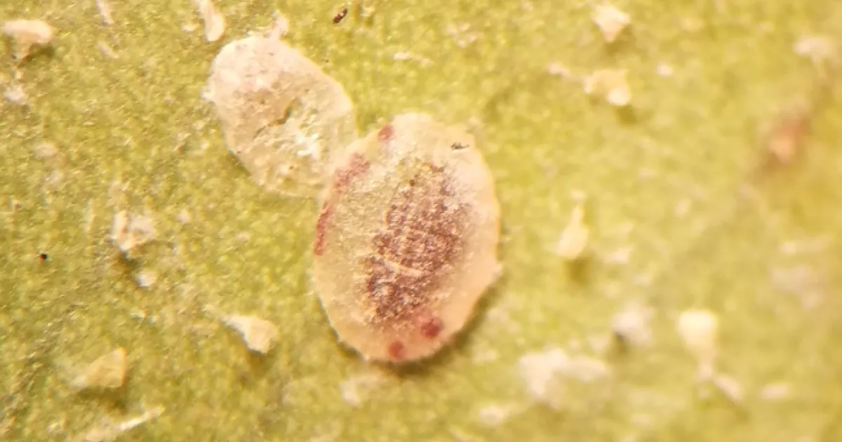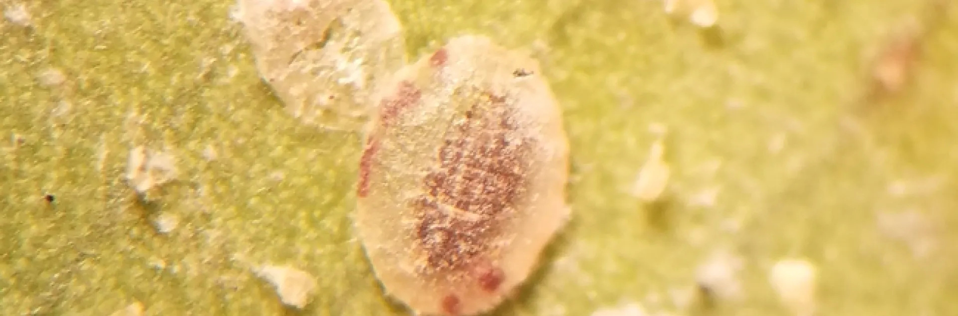 I went back up in the bucket to cut and remove the caged limbs. I went through all the leaves and lo and behold, one of the parasitoid species we released into the cages appears to have successfully attacked the whiteflies! Note the black body inside the whitefly nymph in the photo. Biological control at work!