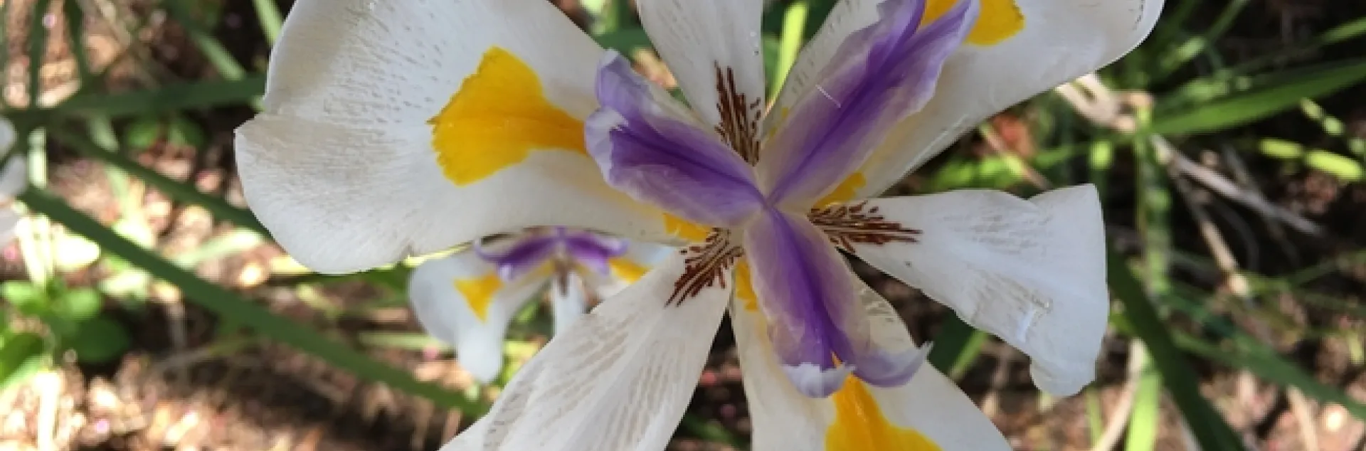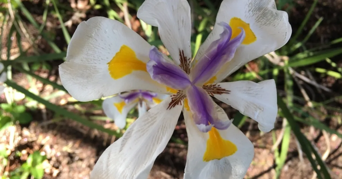 This South African native is a popular choice in California gardens because of its colorful flowers and suitability to a variety of landscape situations. A member of the iris family, it produces large white flowers with violet and yellow markings and is the showiest of the fortnight lily species. Its blooms seem to come at two-week intervals, hence the common name, fortnight lily. Each bloom lasts only one day but is quickly replaced by another one. Flower cycles occur on the same stalk; breaking off forming seed pods increases flower production and minimizes the spread of unwanted volunteer plants. Flowers are followed by 2 inch long green capsules containing very dark brown seeds that are dispersed when the capsule splits open.