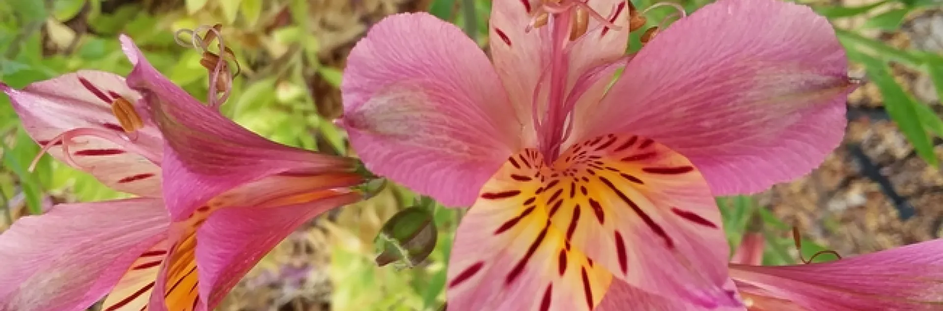 Narrative: Colorful, easy to grow, low maintenance and faithful re-bloomers, Alstroemeria are perennials that flourish massed in flower beds or grown in containers. The dramatic blooms range from white and yellow to red and purple, with many shades in-between. Multiple 6-petal blossoms with contrasting flecks and stripes sit atop green, sword-shaped alternating leaves. The stems grow vertically from horizontal rhizomes. Cut flowers last up to two weeks indoors; longer if not cut. When removing blossoms or deadheading, do not cut the stem. Instead, gently twist the stem from the base of the plant and pull. This will prompt the plant to produce more blossoms over several months.