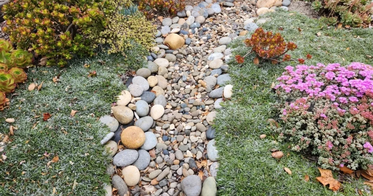 My roof provides more rain than the barrels accommodate, so I have sought additional solutions. Directing downspouts to planted areas points the water to a useful destination once the rain barrels are full. Creating a bioswale channel with curves and mounds to form a dry riverbed with stones and vegetation is visually pleasing during the year, and functional in the rainy season to slow, spread, and sink water into the soil as it journeys across the landscape. Succulents fare well in my bioswale, pictured above, along with Dymondia (Dymondia margaretae) as a ground cover.