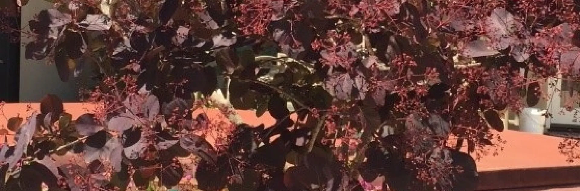 NARRATIVE: This deciduous large shrub or small tree is a standout. Its compact size and reddish-purple leaves lend welcome contrast to green landscapes, but its delicate smoky bloomssteal the show. Smoke trees make excellent specimen plants, borders or hedges.