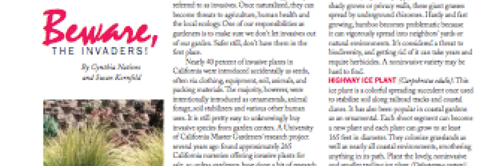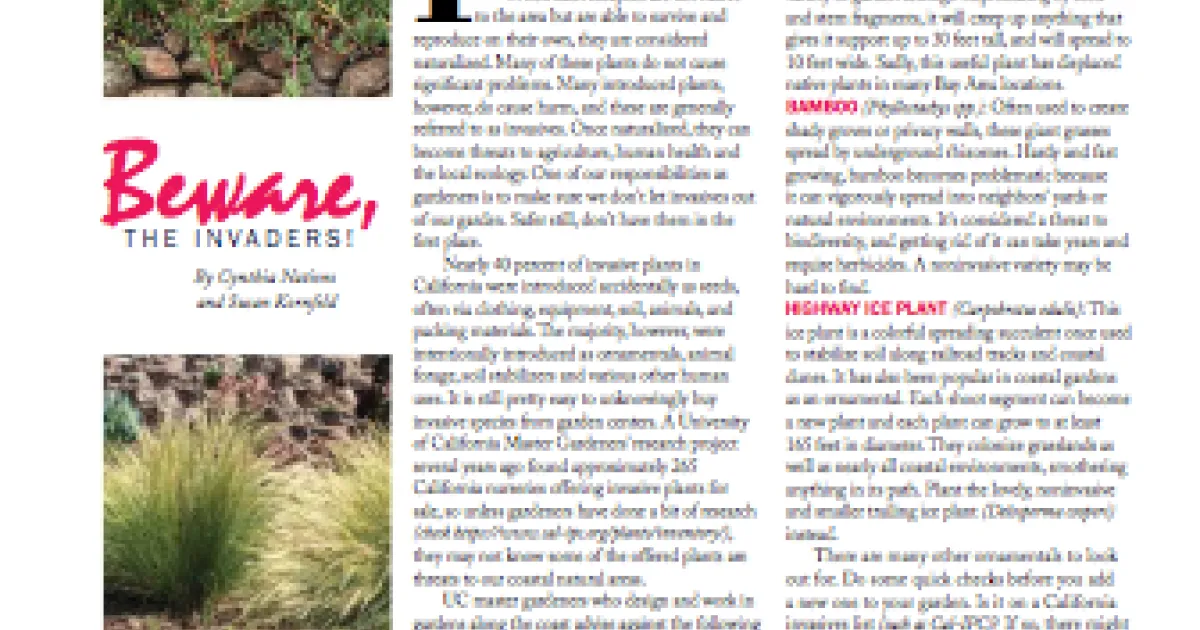 There are many other ornamentals to look out for. Do some quick checks before you add a new one to your garden. Is it on a California invasives list (such as Cal-IPC)? If so, there might be a better alternative (plantright.org). Read the nursery or grower's information on the plant container. If it says the plant "reseeds happily," or "establishes itself quickly," or "spreads easily," take a second look. Happy gardening!