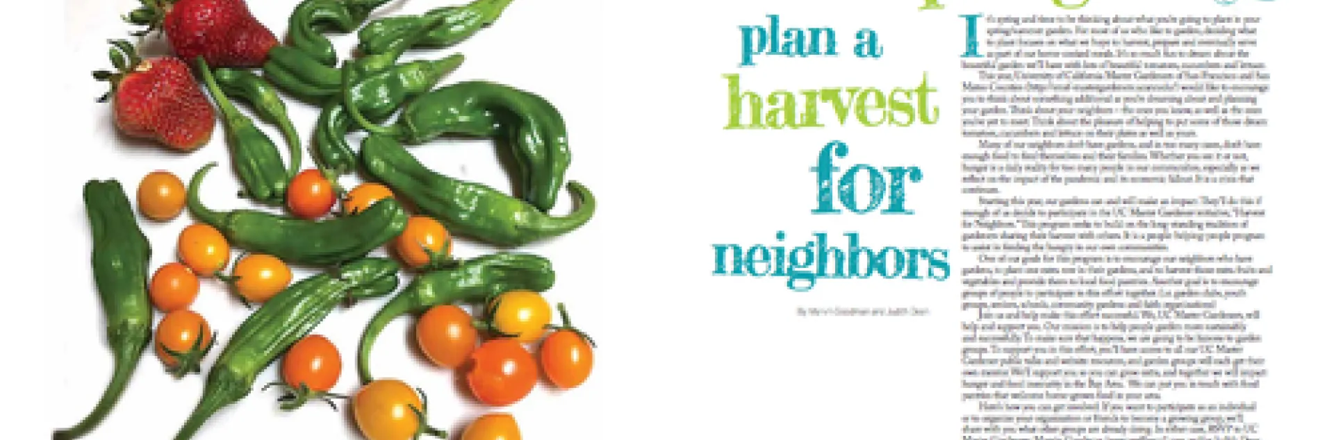 This year, University of California Master Gardeners of San Francisco and San Mateo Counties would like to encourage you to think about something additional as you're dreaming about and planning your garden. Think about your neighbors – the ones you know, as well as the ones you've yet to meet. Think about the pleasure of helping to put some of those dream tomatoes, cucumbers and lettuce on their plates as well as yours.