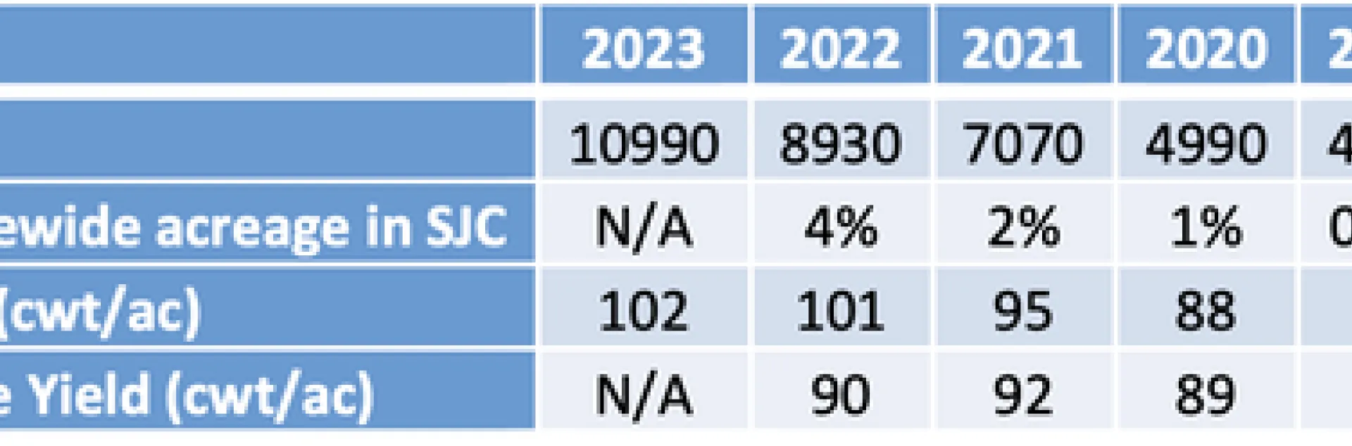 *Rice acreage and yield according to the San Joaquin County (SJC) Agricultural Commissioner's Crop Reports. Rice acreage in SJC is primarily in the Delta region. Delta acreage in other counties is not included in these statistics. At the time of publishing, 2023 CDFA statewide data were not yet available (N/A).