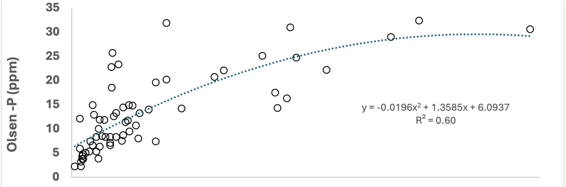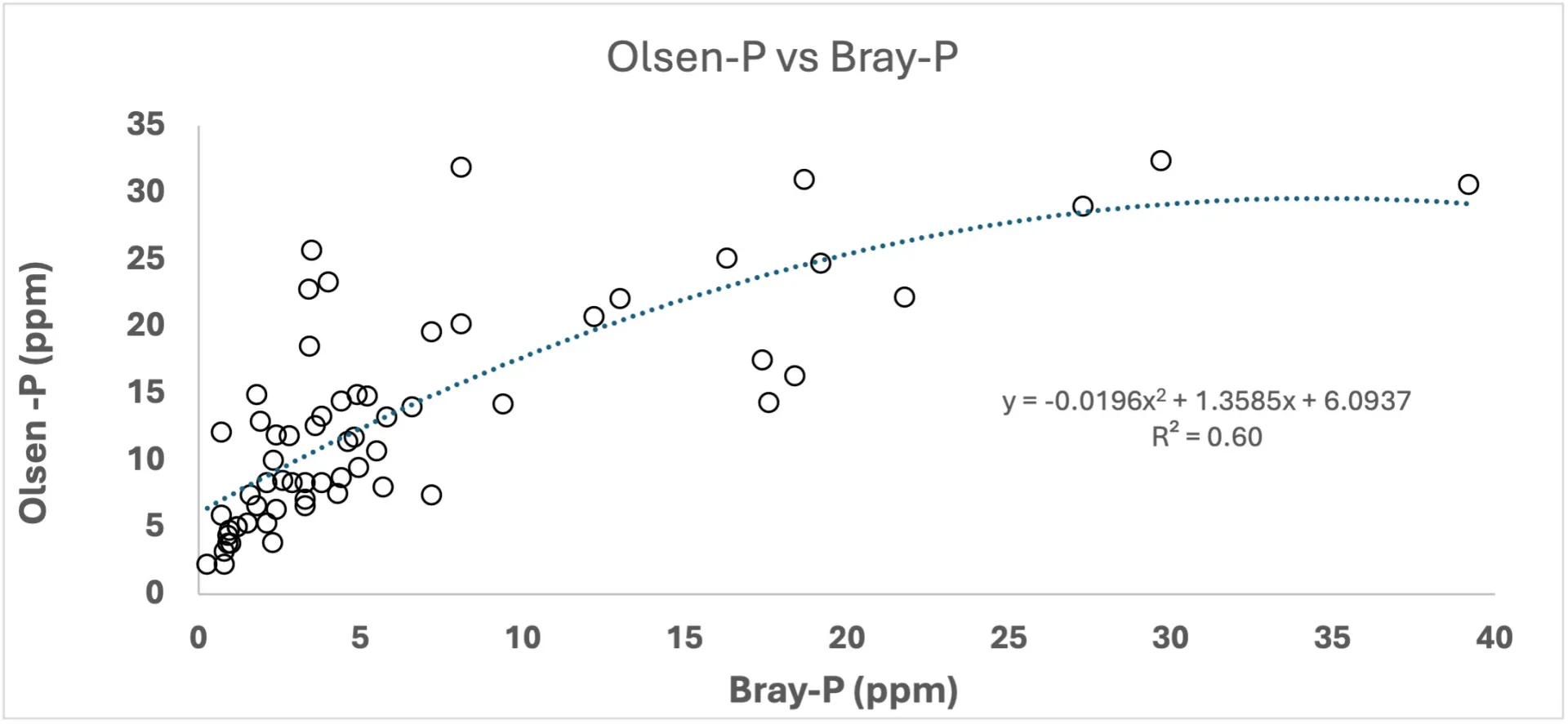 Based partially on the graph above (Figure 1), but also on other data, a conservative Olsen-P value of 12 ppm or higher suggests that your soil is not deficient for P. For the Bray-P test there is a large cloud of data that makes it hard to determine the critical P level.