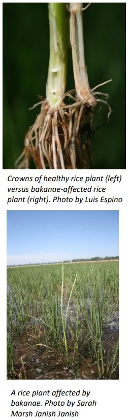 Bakanae is a disease that is caused by the fungus Fusarium fujikuroi, which causes overproduction of the plant hormone gibberellin and the mycotoxin fusaric acid. In normal quantities, gibberellin stimulates cell elongation and regulation of plant stature; however, the excess production of the hormone results in a plant that is overly elongated, spindly, and chlorotic. As the plants mature, the crown of the plant will rot, and most plants will die prior to producing a panicle. If a panicle is produced, the kernels will not fill.