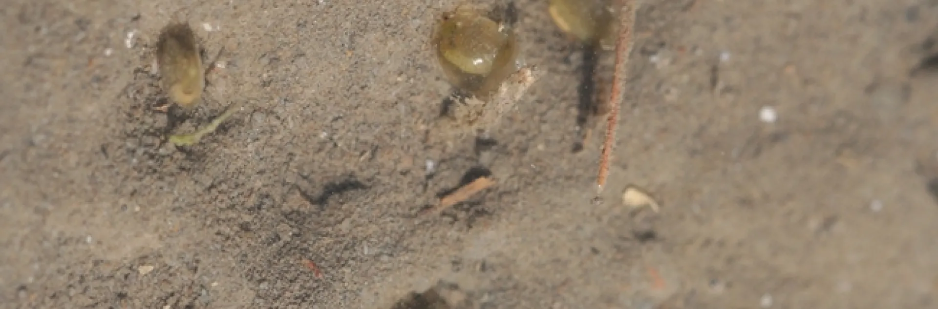 Clam shrimp are small crustaceans that look like a miniature clam; they are about a tenth of an inch and swim in the water slowly. Clam shrimp don't have the "tail" that tadpole shrimp have at the end of their shell. Most freshwater clam shrimp feed on algae and organic detritus. I am not sure what the ones in rice fields feed on, but they do not injure the rice. In the past, I have noticed that these clam shrimp come back after a tadpole shrimp treatment very quickly.