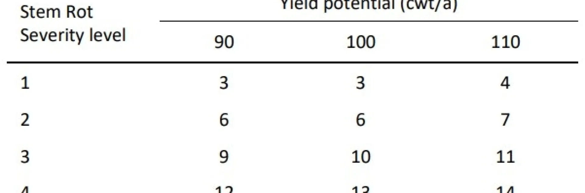 The severity of stem rot is determined at drain time using a ranking that goes from 0 (no disease) to 4 (tillers rotted through). Several years of trials have shown that for each increase in severity level, there is a 3.2% yield loss. The table below shows the yield losses that can be expected under each severity level for three different yield potentials.