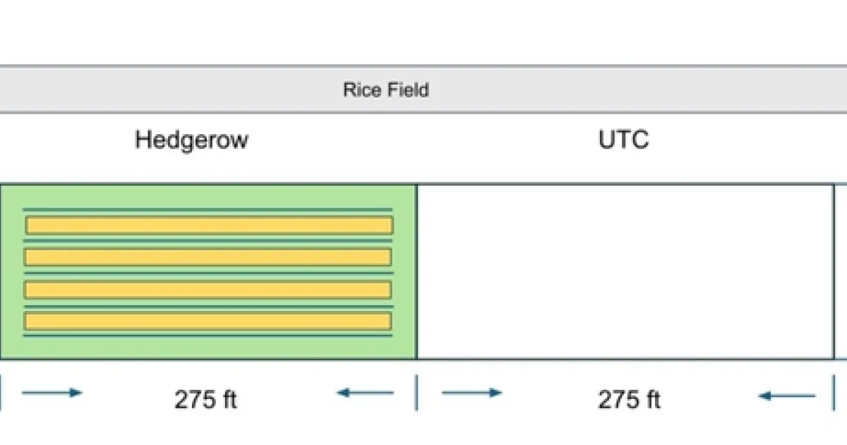To evaluate the benefits of hedgerows on insect populations, we used pit traps (in the ground) to collect the crawling insects and sticky traps to collect flying insects. We set up three pit traps and three sticky traps from the east, center, and west sections of the hedgerow area and unplanted control area and collected data monthly from May to September in 2024. In addition to traps, we used insect nets to sample insects from the tops of hedgerow plants, unplanted control areas, and adjacent rice fields. We conducted sweeps once each from the east, center, and west sections of both the hedgerow and unplanted control areas. We also conducted three sweeps at 40, 80, and 120 feet from the edge of both the hedgerow and unplanted control areas. Like the traps, insect sweeps were performed monthly from May to September in 2024.
