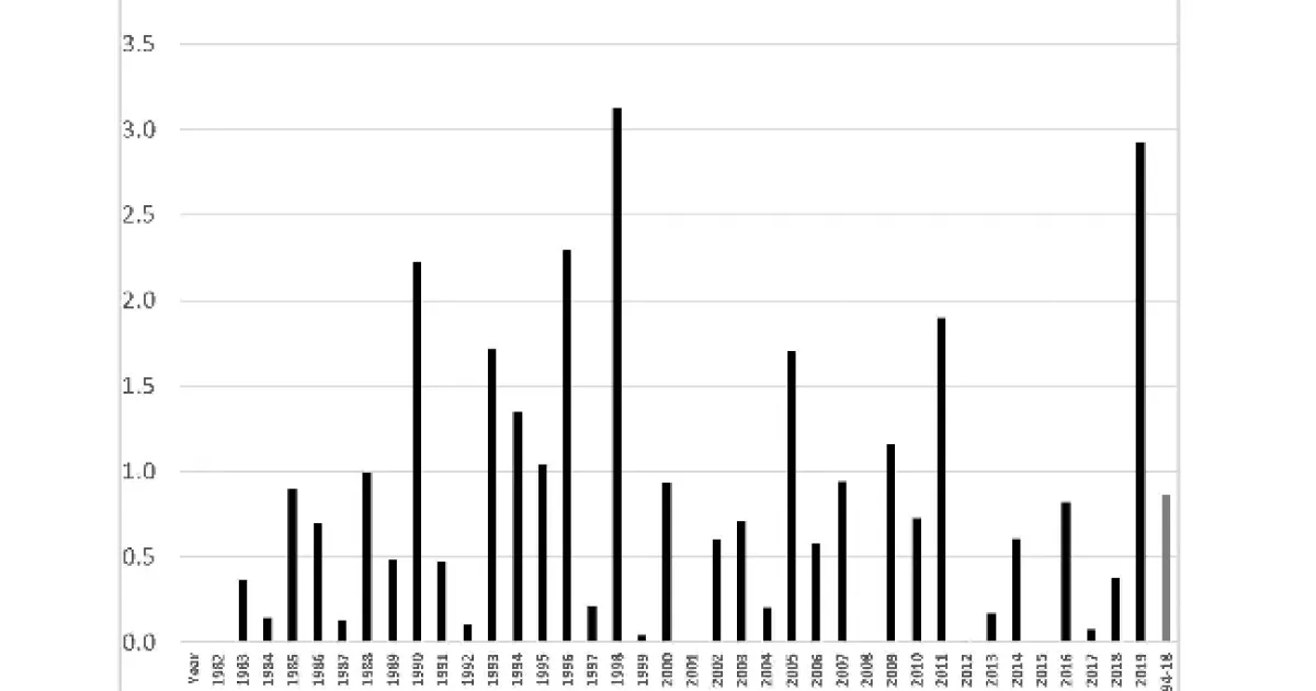 1983-2019 May rainfall. Data are an average from three CIMIS stations (Durham, Colusa and Davis).