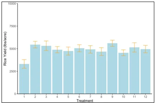 Results (averaged across the 5 locations) indicate that Regiment® followed by Stam® (9), and Stam + Clincher® (7) are good candidates for watergrass control. Those 2 treatments showed great watergrass control and high yields (Figures 6 and 7). Additionally, only mild phytotoxicity was observed throughout the duration of the trial for these treatments (Figure 5). Treatments that are not quite as good in grass control but good in a rotation include Stam® + Shark® (5), Stam® + Abolish® (4). These treatments resulted in less effective watergrass control compared to treatments 9 and 7 (Figures 2 and 3), but yields were similar. In these treatments, Stam® can be substituted with SuperWham®.