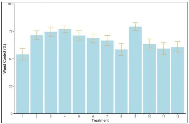Figure 3: Percent watergrass control (%) (Treatments 2-12) compared to the untreated control (Treatment 1) in 2023 (21 Days After Application). Treatment 1 (Untreated) is the percent watergrass cover per plot, not the percent control. Averages are across 4 sites (Rice Experiment Station was not included due to low watergrass populations).