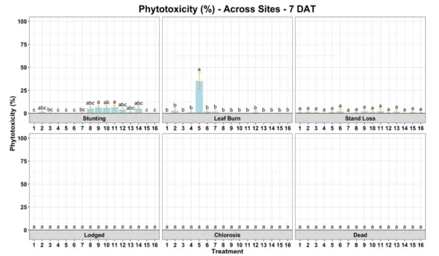 Figure 5: Phytotoxicity (Tip Burn, Stunting, and Stand Loss) in 2024 field testing (7 Days After Application) averaged across all 5 sites.