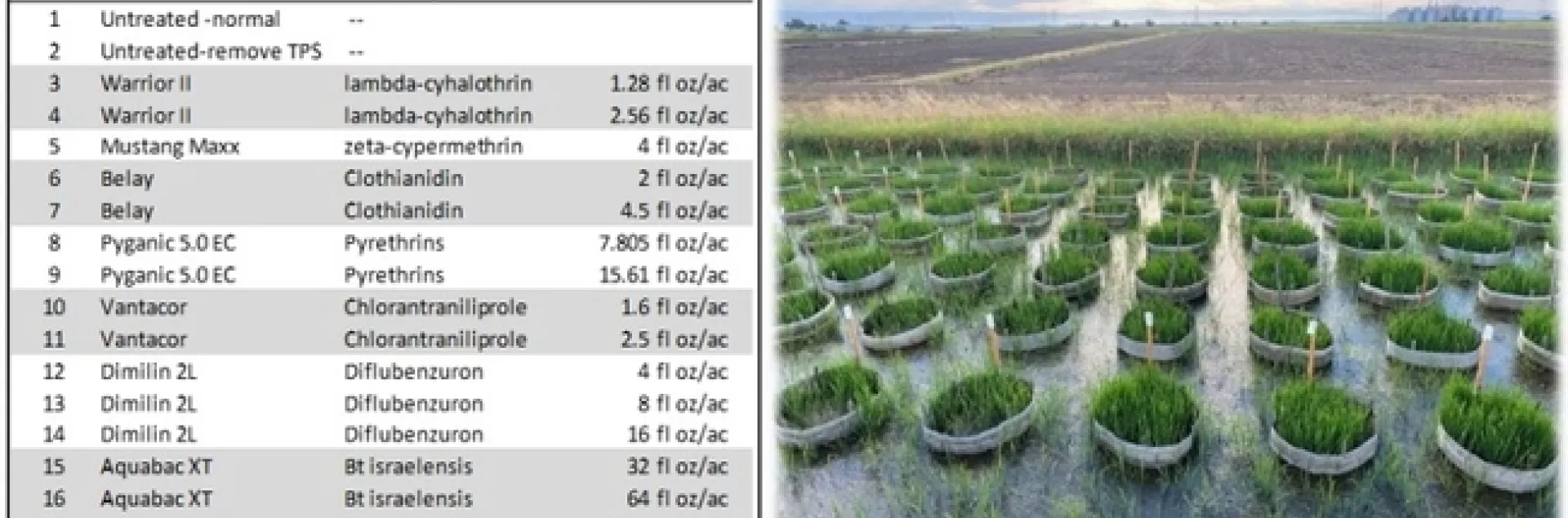 These results were a bit more “pronounced” than our 2022 trial in that the materials generally worked better across the board. The general lack of efficacy we saw with pyrethroids was consistent though. Vantacor and Aquabac XT were especially effective, even at the lower rates we tested, so this is something we think will be worthwhile following up on and learning more about their possible fit in rice IPM.
