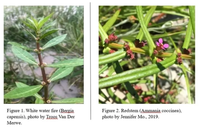 White water fire looks similar to another common rice field weed, redstem (Ammania spp). However, the two species are not from the same plant family and are therefore not closely related. Due to the similarity, white water fire is quite difficult to identify in the field. One of the key distinctions is the thickness of the leaves, which are much broader in white water fire than in redstem. Another key distinction is flower color. The flower color of white water fire is white, whereas redstem can have either purple or red flowers.