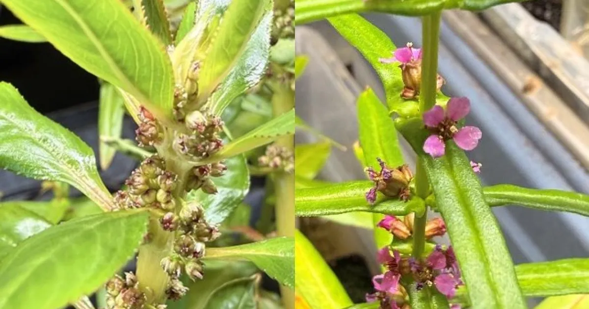 Redstem on the other hand has narrower, thinner, linear leaves with a very distinct shape characterized by the base of the leaf wrapping around the stem, with the shape known as auriculate, and the overall shape of the leaf being lanceolate. These all are surrounding the stem, which distinctly varies from red to green with a clear square/rectangular shape. The internal portion of the stem differs significantly from that of White Water Fire, featuring a distinct, large pith in the stem area. This pith is surrounded by a more sponge-like aerenchyma/cortex with air spaces that are less organized than those of White Water Fire plant. Another key feature is the flowers, which typically exhibit purple to pink flowers.