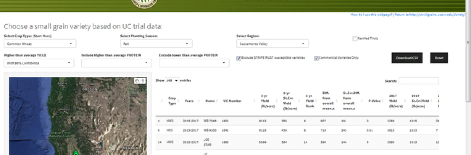 The tool is designed to help users pinpoint small grain varieties that have performed well in particular regions and environments of California using data from multi-year, multi-location field trials. The main features of the tool are a series of selection menus that interact with a map to give the user real-time feedback on how particular crop selections are represented geographically in the trial data, and a custom table that is returned based on these selections and can then be modified based on a series of additional selections available to the user.
