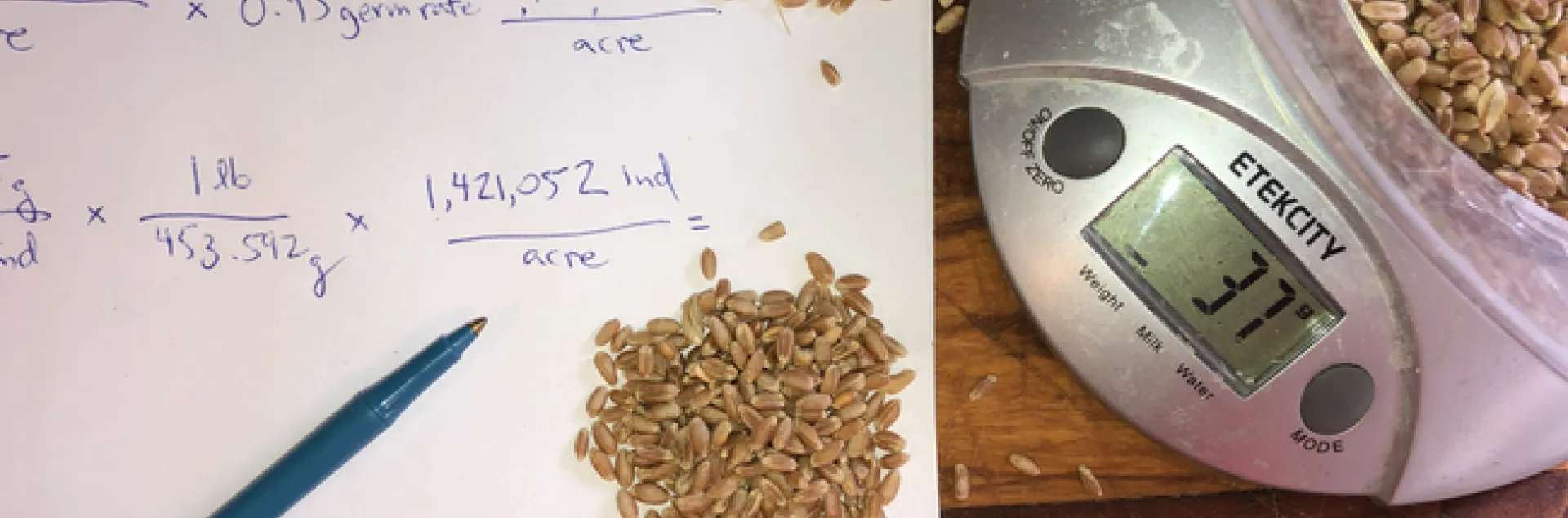 Seeding rate is an important consideration for small grain growers at planting. There are a number of agronomic factors that help to determine the ideal seeding rate such as whether a field will be irrigated, the potential for weed pressure or lodging, the planting date, crop type, and seed germinability. In addition, there can be a large range of seed weights among different small grain varieties and from one seed lot to the next. To achieve full yield potential under irrigated conditions in California, 25 to 30 plants per square foot is a good target density for wheat. As a seeding rate this translates to approximately 1.2 million seeds per acre with a seed weight of 40 gram per thousand seeds. However, adjustments to the seeding rate are often needed based on the kernel weight and germination rate of the seed lot as well as other planting conditions.